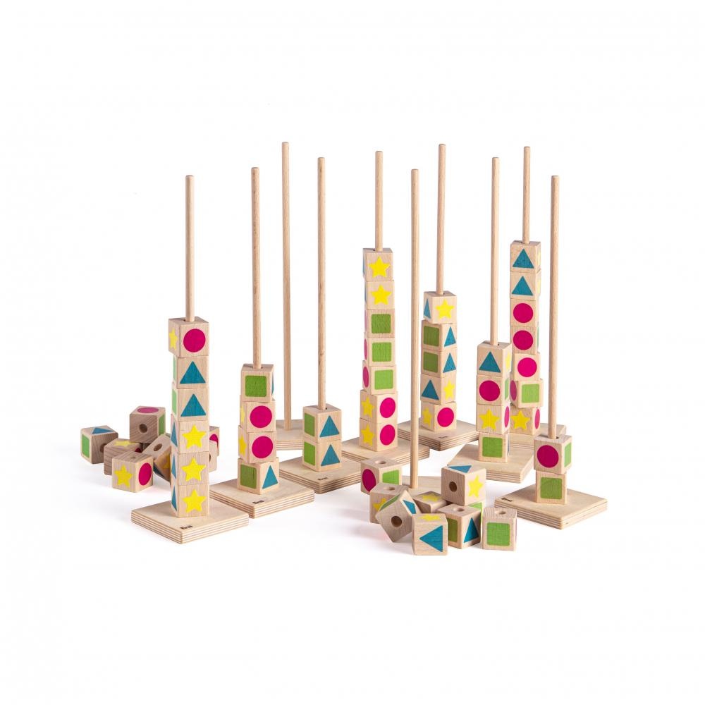 Inhalt: 10 Steckbretter, 55 Würfel (3x3x3 cm) Material: Birkensperrholz, natur; Buche, farbig bedruckt Wie ist eine Zahl untergliedert? Durch welche anderen Zahlenkombinationen kann sich eine Zahl zusammensetzen? All diese Fragen lassen sich durch die optische Darstellung der Zahlzerlegung klar und einfach visuell erfassen. Unsere Lernspiele fördern die Feinmotorik und die Hand-Auge-Koordination. Unsere Zähltürmchen ermöglichen Kindern im Vor- und Grundschulalter spielerische Zahlenerkundung. Sie helfen ein Vorstellungsvermögen für Mengen zu entwickeln. Ebenso veranschaulichen sie spielerisch - und auf einfachste Weise - die Zahlzerlegung, einfache Addition und Subtraktion, sowie die Begriffe größer als und kleiner als. Auf den Steckbrettchen können mit den Würfeln die Zahlen 1 bis 10 anhand von vier verschiedenfarbigen Symbolen veranschaulicht werden (Stern-gelb, Dreieck-blau, Quadrat-grün, Kreis-pink). Dadurch kann das kindliche Auge schnell kleine Mengen erfassen und damit umgehen. Die klare Symbolik ermöglicht hierbei auch farbenblinden Kindern, die Thematik barrierefrei zu erfassen.