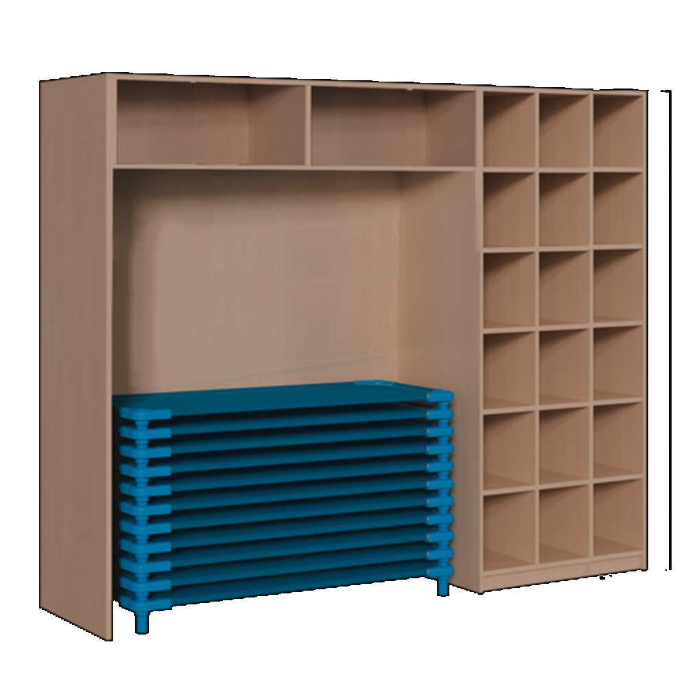 Bis zu 20 Kinderliegen lassen sich in dem Regal unterbringen. Und das Praktische dabei: das Bettzeug lagert gleich in Reichweite. 20 hygienisch getrennte Fächer sind dafür vorgesehen. Das Korpusdekor können Sie nach unserem Dekorangebot wählen.